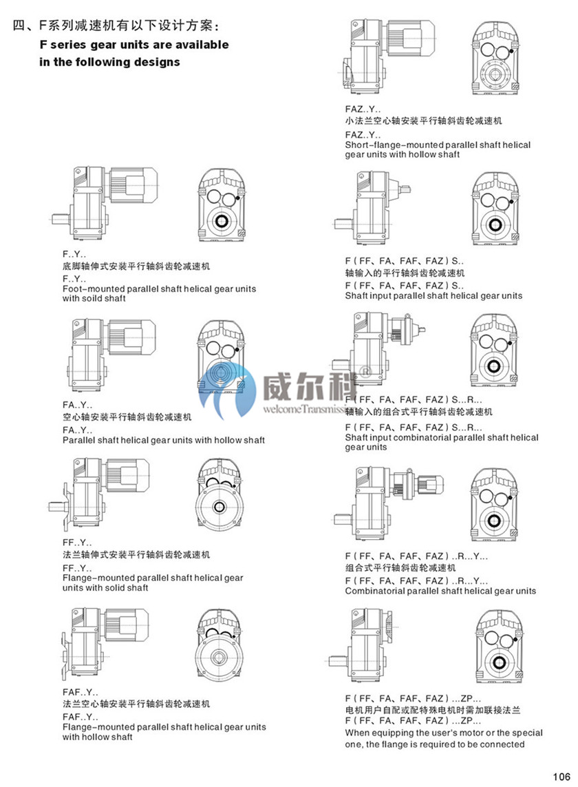 F系列平行軸斜齒輪減速機,結(jié)合國際技術(shù)要求制造 ,具有很高的科技含量,節(jié)省空間,可靠耐用,承受過載能力高,功率可90KW一上,能耗低,性能優(yōu)越,減速機效高達95%以上 ,振動小嗓音低,節(jié)能高,選用優(yōu)質(zhì)鍛鋼材料,鋼性鑄鐵箱體,齒輪表面經(jīng)過高頻熱處理,經(jīng)過精密加工, 確保軸平行度和定位的精度,這一切構(gòu)成了齒輪傳動總成的減速機配置了各種類電極,形成了電極一體化,完全保證了產(chǎn)品使用質(zhì)量特性
