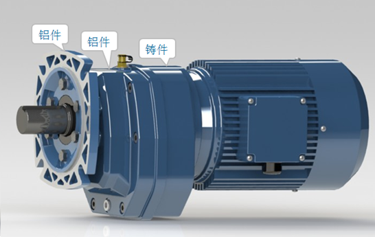 (1)、輕量化設計 本款減速機首次采用鋁件(法蘭與箱體)與鑄件(端蓋)相結合的設計理念(如圖1),在保證強度的情況下,大化的減輕整機重量,使整機重量降至21KG(以接0.75KW電機為例)。同時端蓋采用鑄件材料能有效的揮發(fā)出高速級所產生的熱量,促使整機溫度平衡。